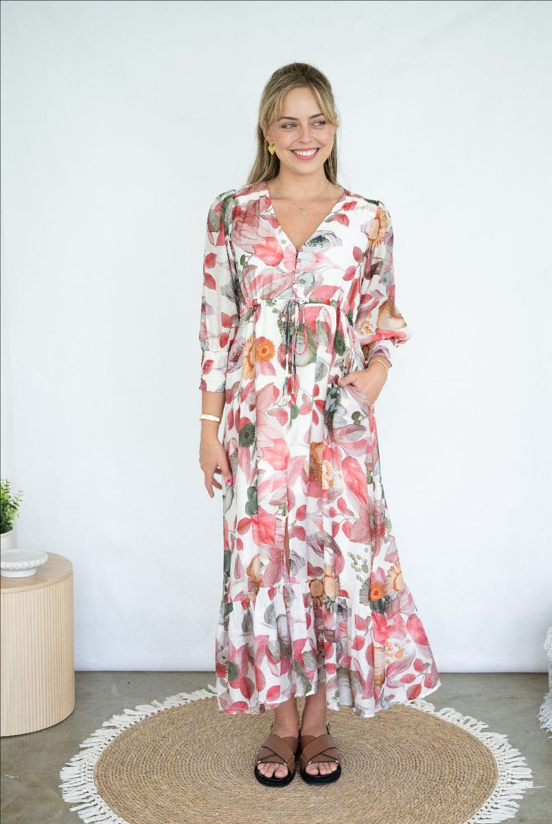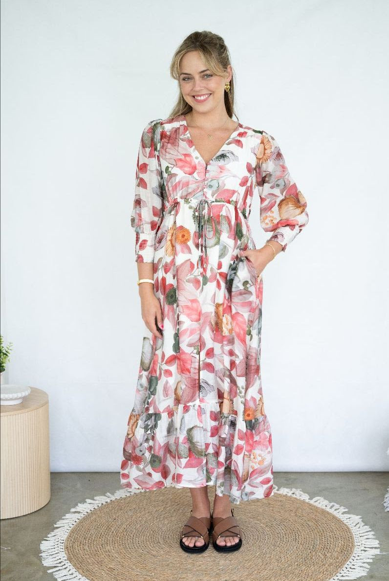 Achieve both comfort and style with Anthel Pink Floral Maxi. Made from a lightweight viscose poly blend, it's perfect for all-day wear. The V neckline and 3/4 sleeve with shirring cuff add a touch of elegance, while the functional buttons and waist tie offer versatility. Stay effortlessly chic in our Anthel Dress.