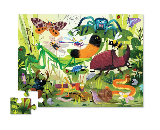 Calling all junior bug lovers! The fascinating world of insects including grasshoppers, ladybirds and roly poly slaters is explored in this 36-piece floor puzzle. All wrapped up in its unique contour-shaped storage box, the jumbo, sturdy pieces of this high-quality puzzle are ideal for little hands.