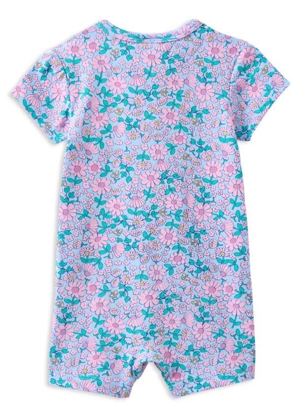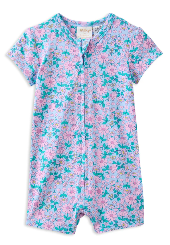 Milky Clothing Daisy Fields Zip Romper offers more coverage than a traditional bodysuit, with short sleeves and longer legs for added comfort. Made with both practicality and style in mind, its blue base and all-over pink floral print it's sure to brighten any day. Featuring a convenient two-way zip for easy dressing on warmer days, this romper eliminates the need for additional shorts, making it a hassle-free and essential addition to your wardrobe.
