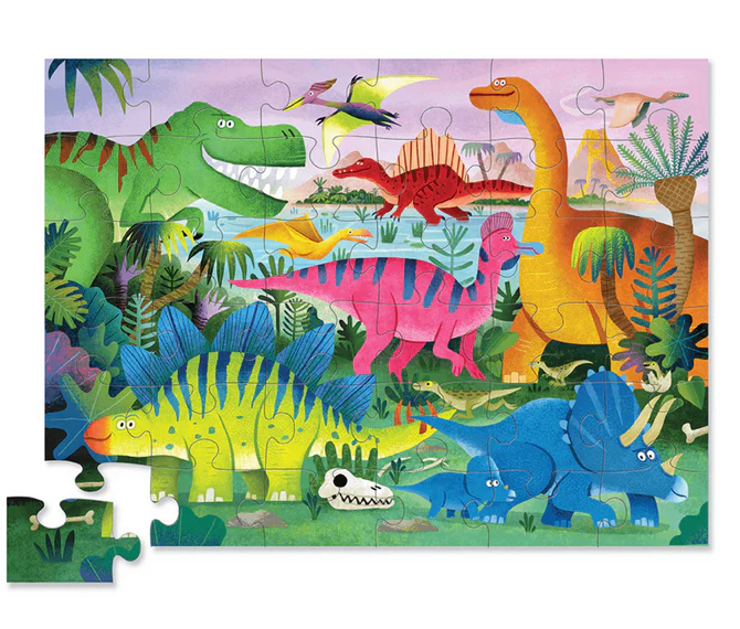 Little dinosaur enthusiasts can brush up on their dino-identification in this beautifully illustrated 36-piece floor puzzle. All wrapped up in its unique contour-shaped storage box, the jumbo, sturdy pieces of this high-quality puzzle are ideal for little hands.