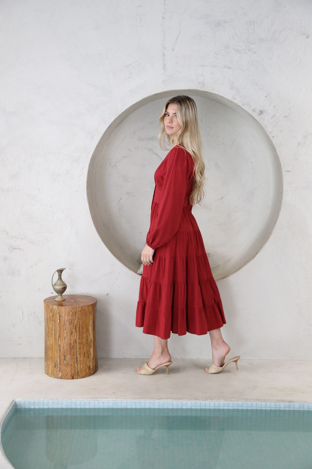 Introducing the Nesta Red Maxi Dress - the perfect blend of comfort and style! Made with 70% Viscose and 30% Linen, it features a flattering v-neckline, elegant long bishop sleeves, and a flowy tiered skirt. The centre-front buttons add a touch of sophistication to this versatile dress. Elevate your wardrobe with Nesta!