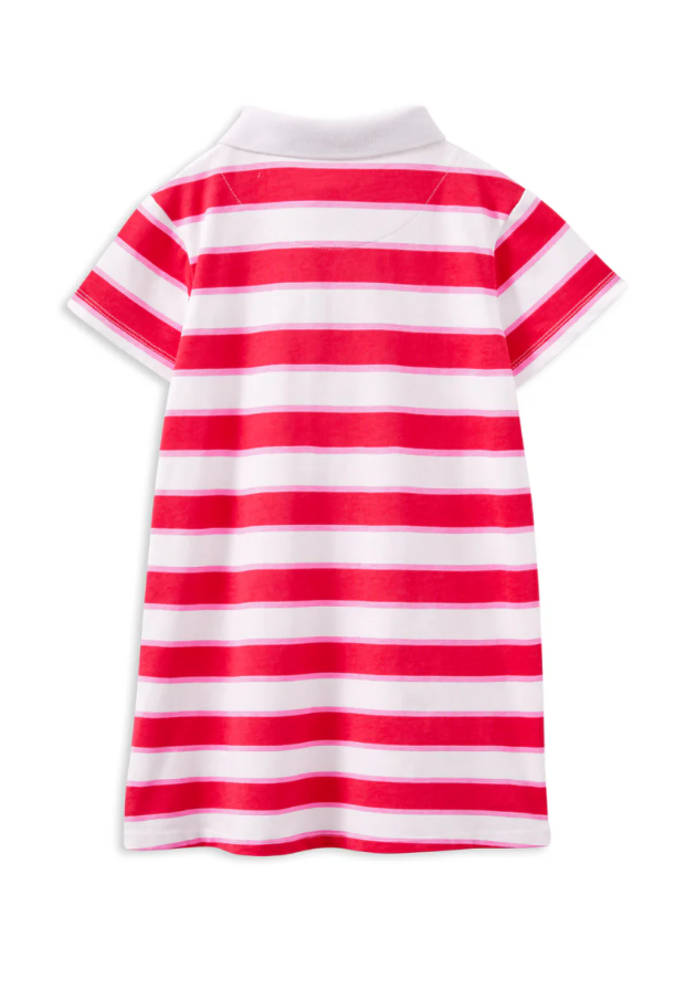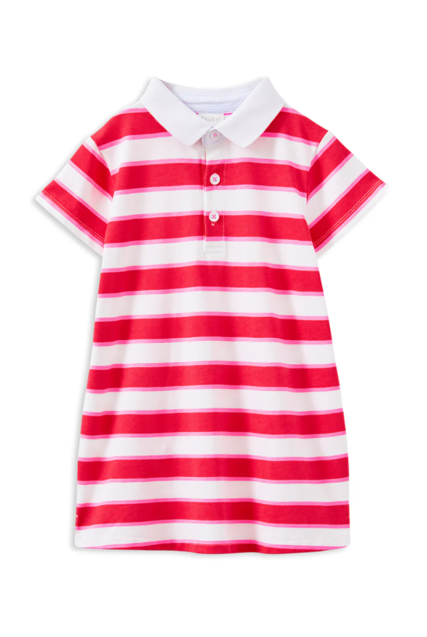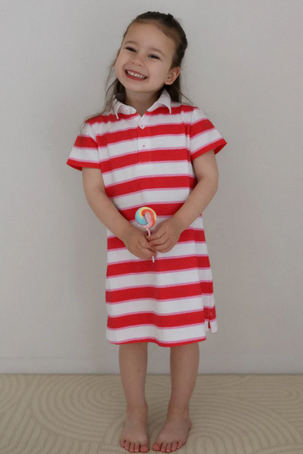Milky Clothing Stripe Rugby Dress. With bold red, pink and white stripes and a classic rugby feel, the Milky Clothing Stripe Rugby Dress brings sporty style to everyday dressing. Crafted from durable 100% cotton rugby fabric, this dress offers structure without sacrificing comfort. Featuring a crisp white collar, short sleeves, and an A-line fit, its perfect for active days and casual outings. Easy to throw on, tough enough to keep up with them.
